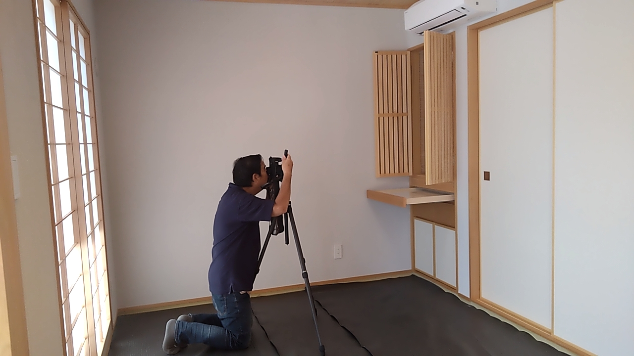 中野の平屋の木の家の完成写真撮影をしました。天気にも恵まれて、外構から写真を撮り始めました。敷地が広いのでカメラのレンズ調整が難しいようでした。室内では各部屋と作り付け家具を撮ってもらいました。畳はお引越し前に敷く予定なので作り付け仏壇スペースのみを撮影していただいてます。