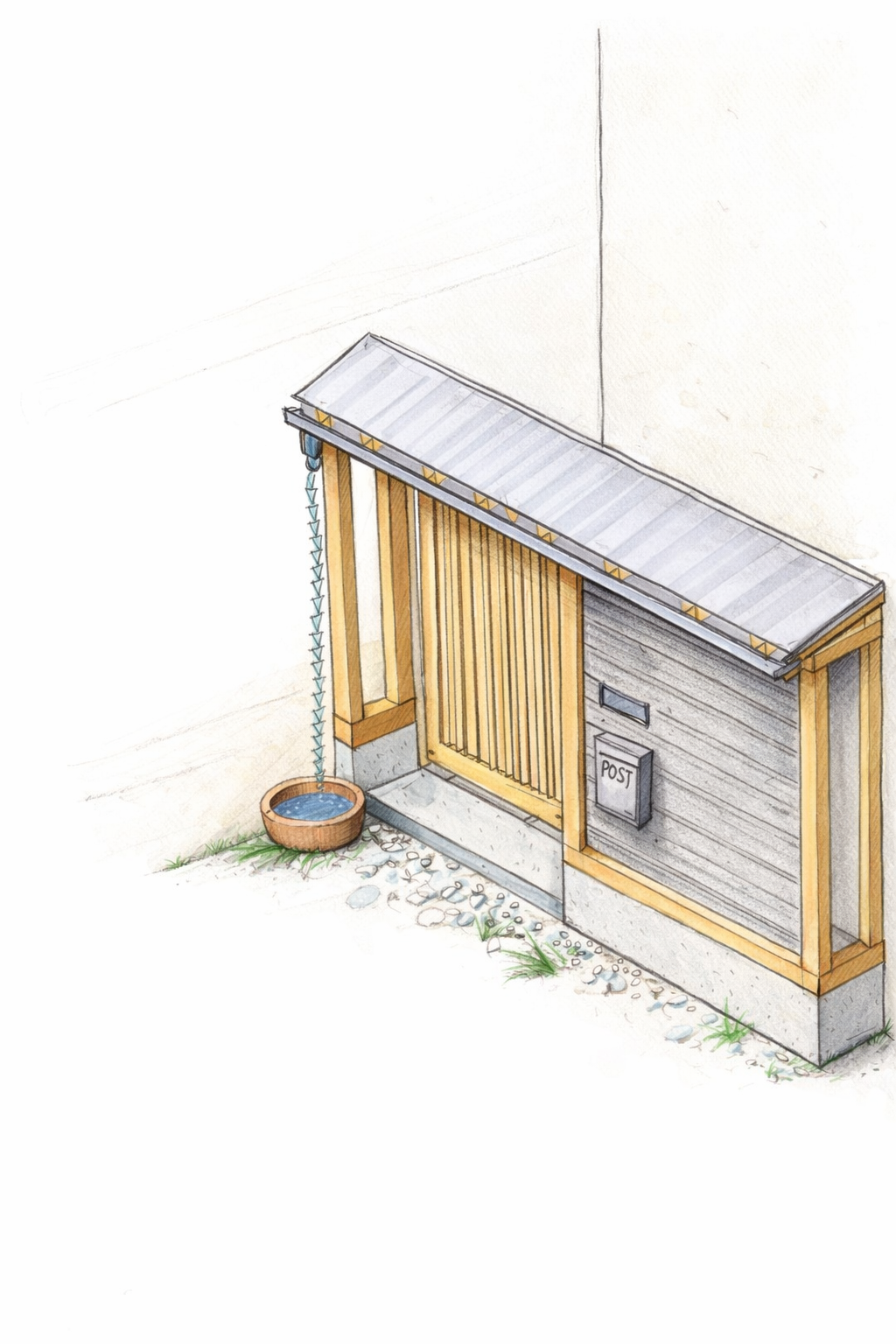 小さな門のスケッチ図です。タテ格子戸、5本の杉の4寸柱、焼き杉の板など最低限の素材で構成しています。