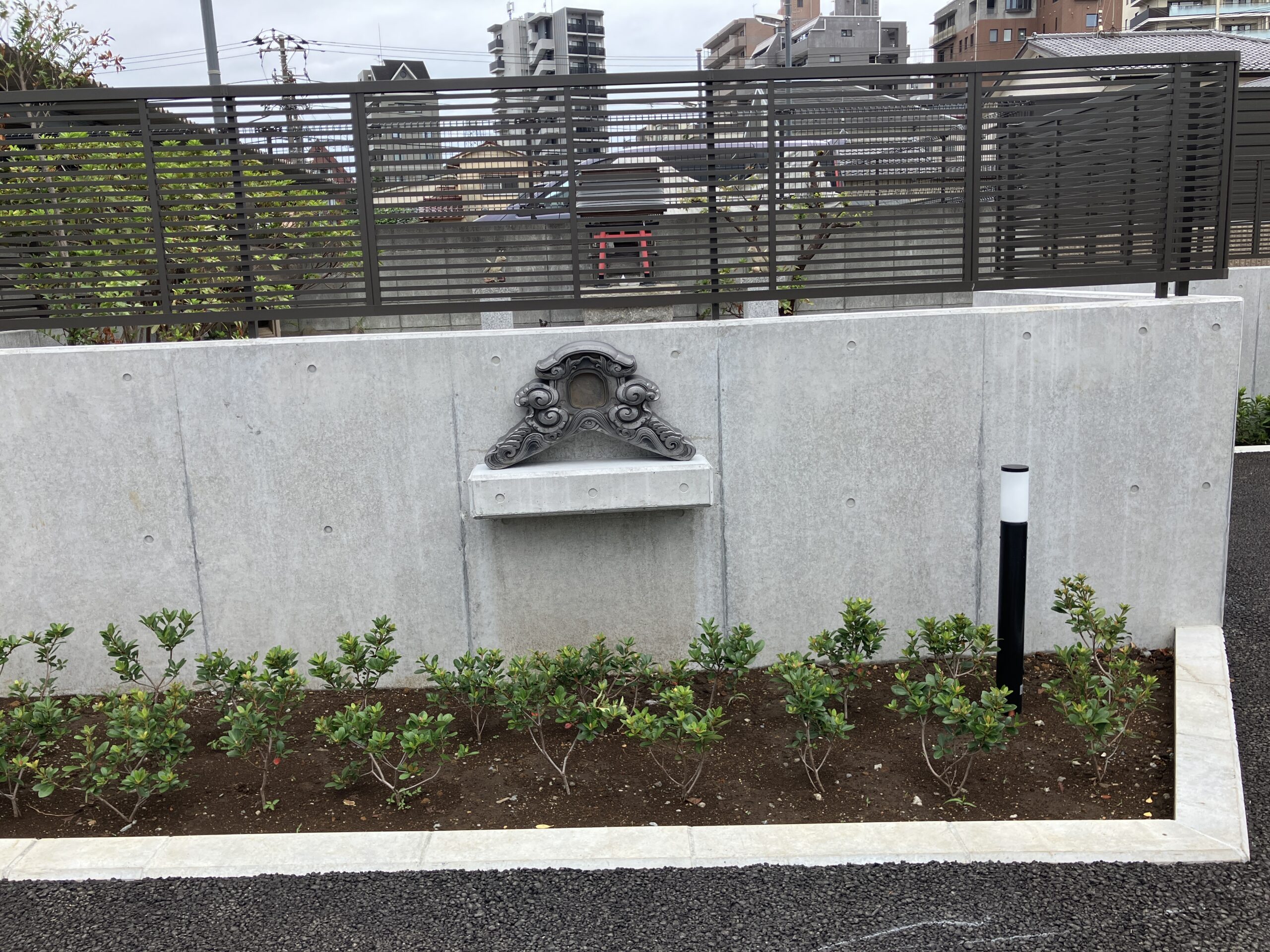 以前の家の屋根に載っていた立派な三州の鬼瓦です。外構の塀に台座をつくり飾っています。