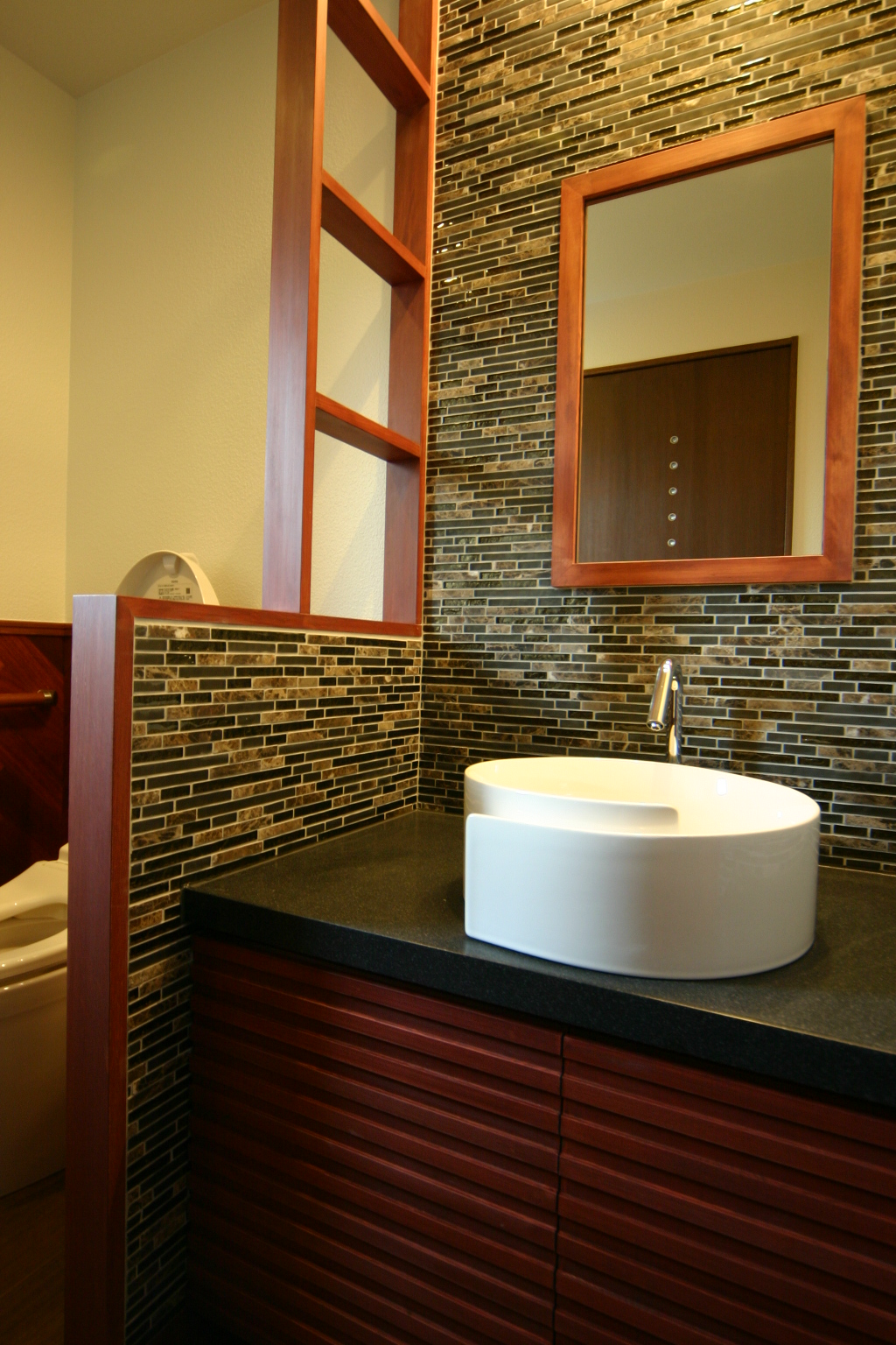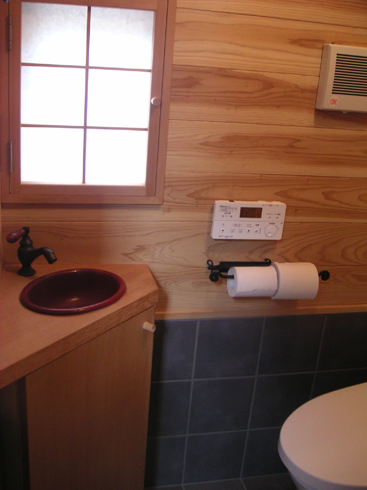 手洗いや水栓、ペーパーホルダー、壁のくりこま杉とタイルなど建築主さんの好みのパーツがいっぱいのトイレです。