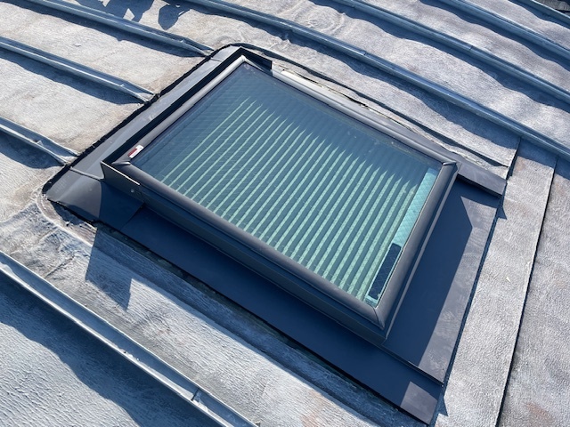 33年が経過したベルックス製トップライトの交換工事を行いました。工事そのものは屋根の外部から1日で完了します。最新のベルックスのトップライトは断熱性能もよく、リモコンでブラインドの開閉をすることもできます。