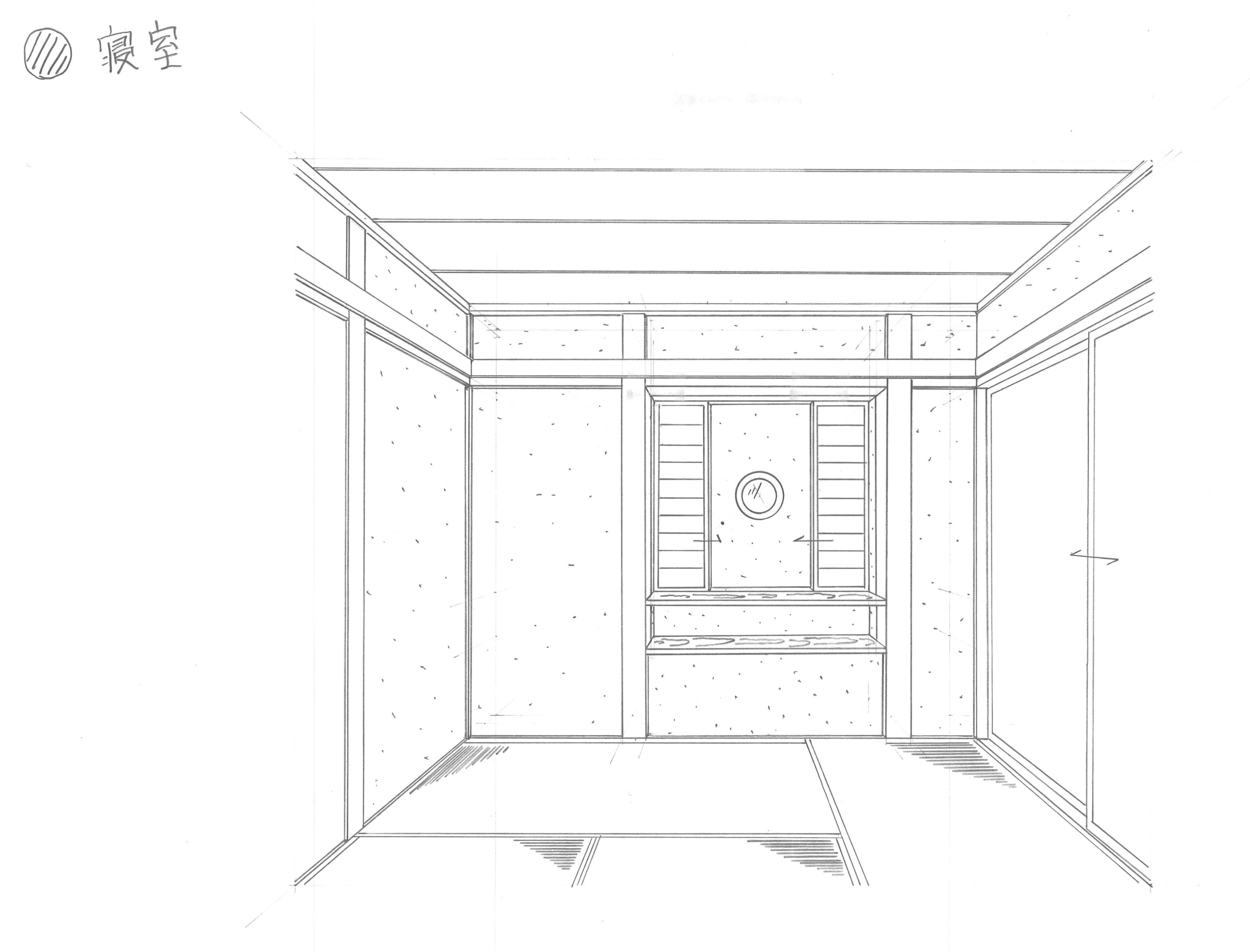 4.5畳の小さな寝室のイメージです。出窓に小さな丸窓を計画しています。丸窓の前には小さな障子を入れています。