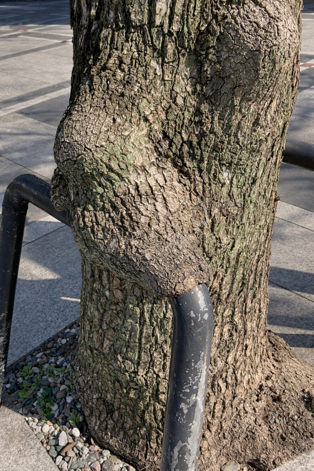 新宿区の道路際の街路樹です。鉄のパイプにかぶりついている姿が通る度に気になっていました。 このままずっと頑張ってかぶりついていつか鉄パイプを食いちぎって欲しいです。 「これからは俺たち木の時代だぞ〜」ってね。